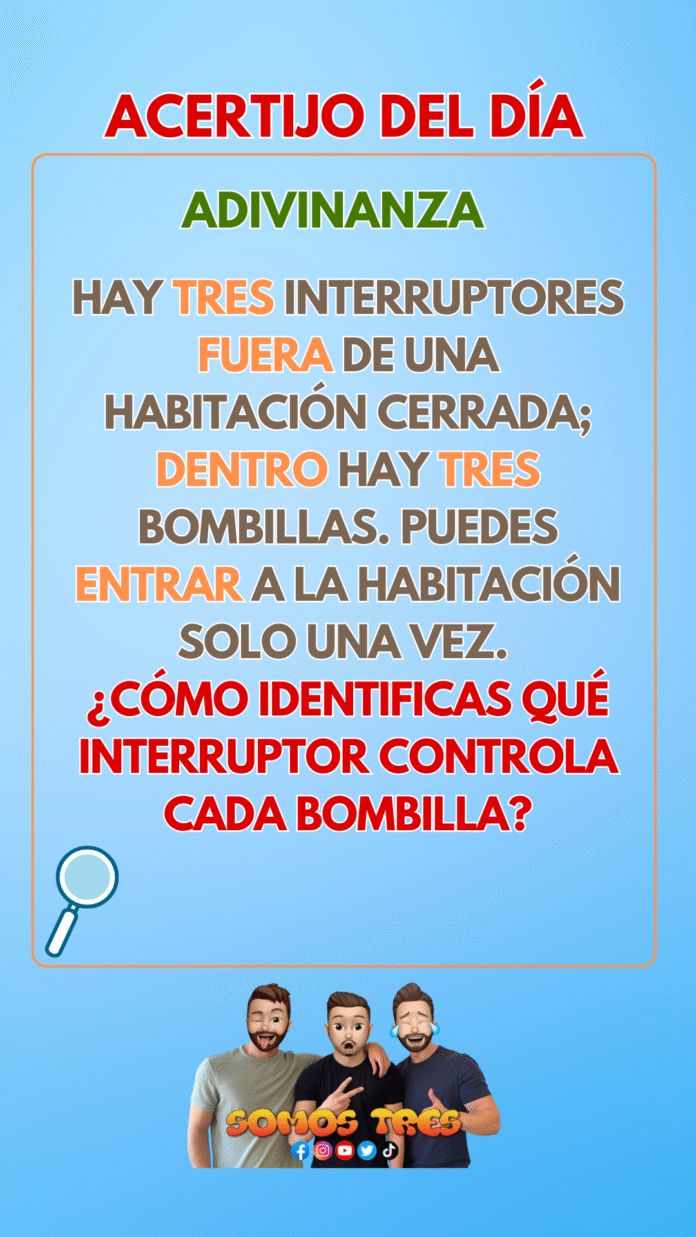 RESPUESTA: ENCIENDE EL INTERRUPTOR A Y DÉJALO UN RATO; APÁGALO Y ENCIENDE B; ENTRA EN LA HABITACIÓN. LA BOMBILLA CALIENTE ES LA A (ESTUVO ENCENDIDA Y SE APAGÓ), LA ENCENDIDA ES LA B, Y LA FRÍA Y APAGADA ES LA C.
