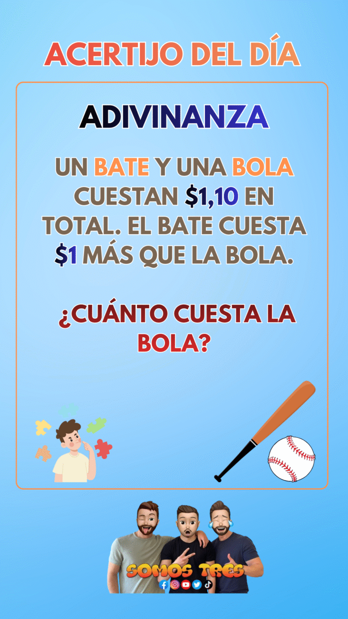InicioSin categoríaACERTIJO DEL DIA Sin categoría ACERTIJO DEL DIA By Somos Tres 25 de noviembre de 2025 0 84 Cuota FacebookWhatsAppTwitterPinterest SOLUCIÓN 👉 La bola cuesta $0.05. Cuota FacebookWhatsAppTwitterPinterest Artículo anteriorACERTIJO DEL DIAArtículo siguienteACERTIJO DEL DIA Somos Treshttps://somostres.tv RELATED ARTICLES Sin categoría ACERTIJO DEL DIA 4 de diciembre de 2025 Sin categoría ACERTIJO DEL DIA 3 de diciembre de 2025 Sin categoría ACERTIJO DEL DIA 2 de diciembre de 2025 - Advertisment - LO MÁS VISTO ACERTIJO DEL DIA 4 de diciembre de 2025 ACERTIJO DEL DIA 3 de diciembre de 2025 ACERTIJO DEL DIA 2 de diciembre de 2025 ACERTIJO DEL DIA 27 de noviembre de 2025 Cargar más