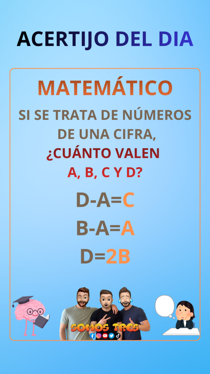 InicioSin categoríaACERTIJO DEL DIA Sin categoría ACERTIJO DEL DIA By Somos Tres 16 de enero de 2026 0 172 Cuota FacebookWhatsAppTwitterPinterest A=1; B=2; C=3; D=4 Cuota FacebookWhatsAppTwitterPinterest Artículo anteriorACERTIJO DEL DIAArtículo siguienteACERTIJO DEL DIA Somos Treshttps://somostres.tv RELATED ARTICLES Sin categoría ACERTIJO DEL DIA 13 de febrero de 2026 Sin categoría ACERTIJO DEL DIA 9 de febrero de 2026 Sin categoría ACERTIJO DEL DIA 5 de febrero de 2026 - Advertisment - LO MÁS VISTO ACERTIJO DEL DIA 13 de febrero de 2026 ACERTIJO DEL DIA 9 de febrero de 2026 ACERTIJO DEL DIA 5 de febrero de 2026 ACERTIJO DEL DIA 3 de febrero de 2026 Cargar más