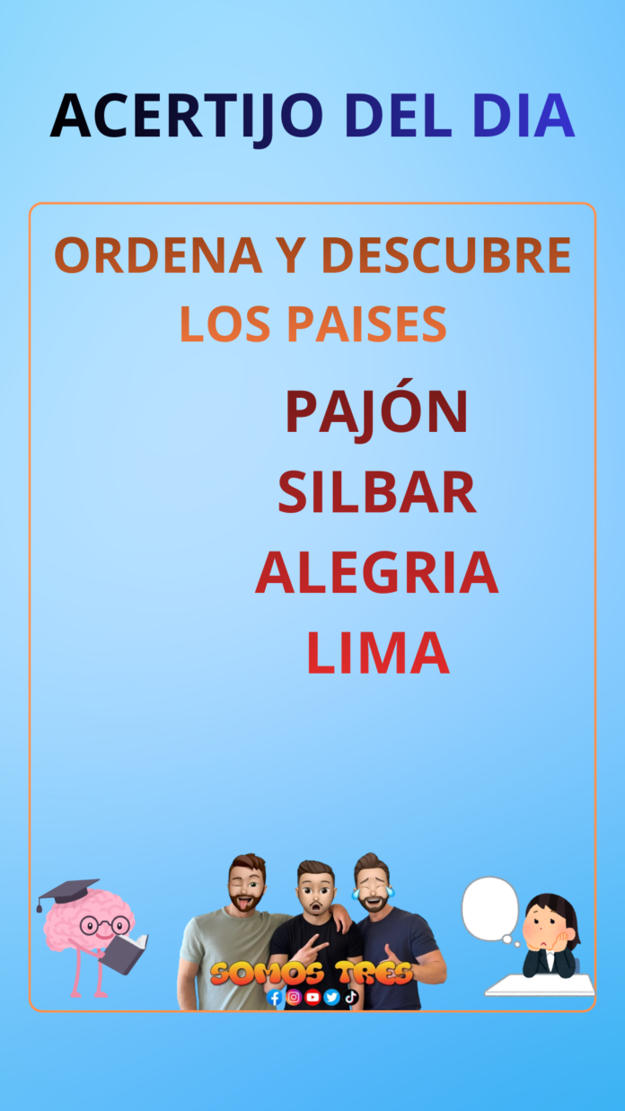 InicioSin categoríaACERTIJO DEL DIA Sin categoría ACERTIJO DEL DIA By Somos Tres 22 de enero de 2026 0 135 Cuota FacebookWhatsAppTwitterPinterest SOLUCIÓN: PAJÓN → JAPÓN SILBAR → BRASIL ALEGRIA → ARGELIA LIMA → MALI Cuota FacebookWhatsAppTwitterPinterest Artículo anteriorACERTIJO DEL DIAArtículo siguienteACERTIJO DEL DIA Somos Treshttps://somostres.tv RELATED ARTICLES Sin categoría ACERTIJO DEL DIA 13 de febrero de 2026 Sin categoría ACERTIJO DEL DIA 9 de febrero de 2026 Sin categoría ACERTIJO DEL DIA 5 de febrero de 2026 - Advertisment - LO MÁS VISTO ACERTIJO DEL DIA 13 de febrero de 2026 ACERTIJO DEL DIA 9 de febrero de 2026 ACERTIJO DEL DIA 5 de febrero de 2026 ACERTIJO DEL DIA 3 de febrero de 2026 Cargar más