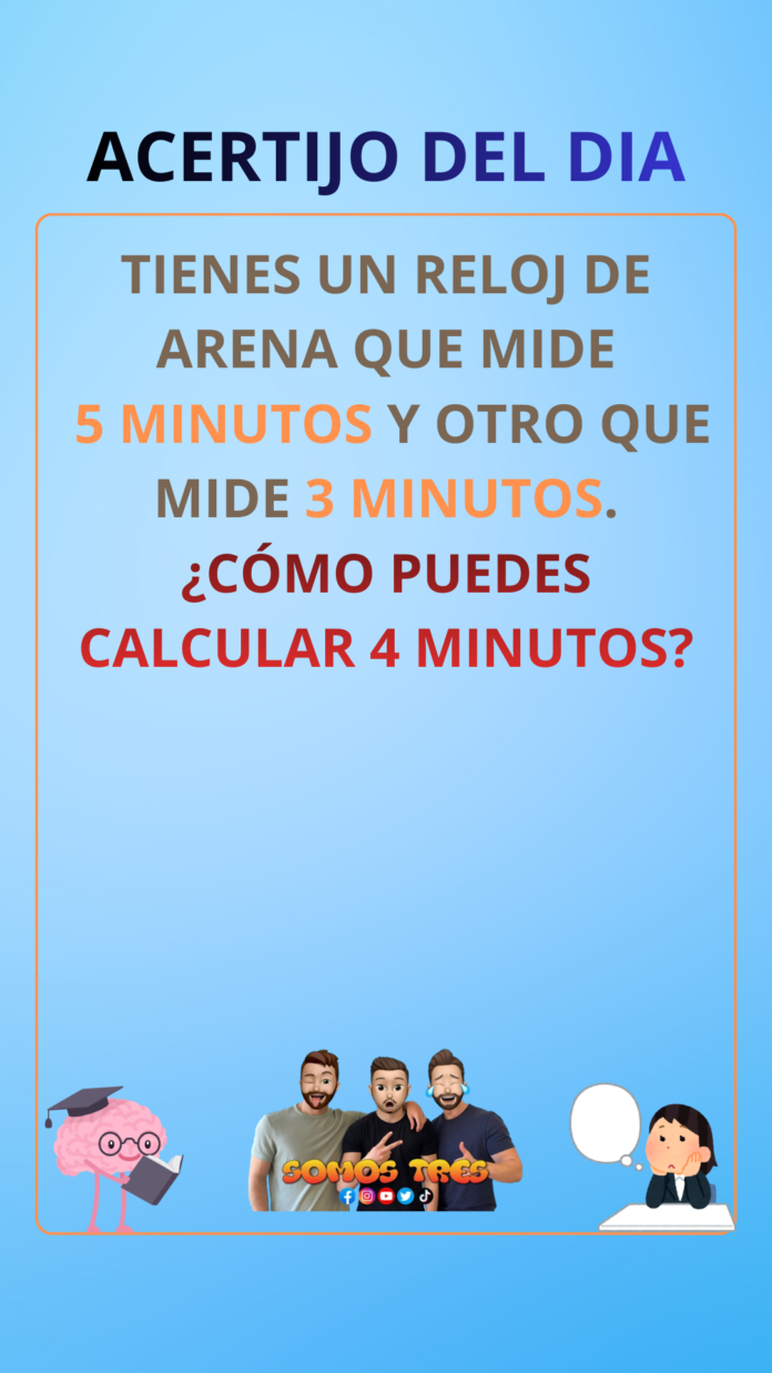 Respuesta: Haz funcionar los relojes al mismo tiempo. Cuando el de 3 minutos se haya agotado, dale la vuelta. Después, cuando el reloj de 5 minutos se haya agotado, al de 3 minutos le quedará un minuto restante. Entonces, al agotarse y volverlo a dar vuelta, habrás medido exactamente 4 minutos.