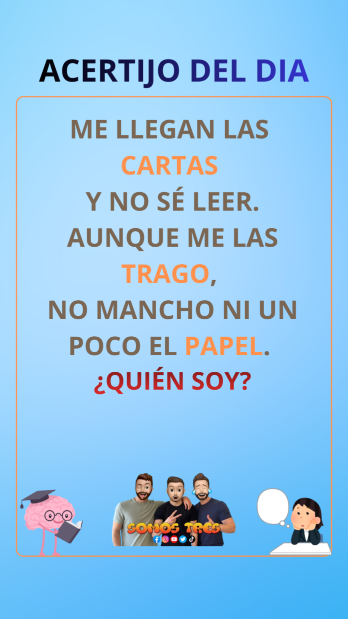 InicioSin categoríaACERTIJO DEL DIA Sin categoría ACERTIJO DEL DIA By Somos Tres 29 de enero de 2026 0 115 Cuota FacebookWhatsAppTwitterPinterest Respuesta: El Buzón Cuota FacebookWhatsAppTwitterPinterest Artículo anteriorACERTIJO DEL DIAArtículo siguienteACERTIJO DEL DIA Somos Treshttps://somostres.tv RELATED ARTICLES Sin categoría ACERTIJO DEL DIA 13 de febrero de 2026 Sin categoría ACERTIJO DEL DIA 9 de febrero de 2026 Sin categoría ACERTIJO DEL DIA 5 de febrero de 2026 - Advertisment - LO MÁS VISTO ACERTIJO DEL DIA 13 de febrero de 2026 ACERTIJO DEL DIA 9 de febrero de 2026 ACERTIJO DEL DIA 5 de febrero de 2026 ACERTIJO DEL DIA 3 de febrero de 2026 Cargar más