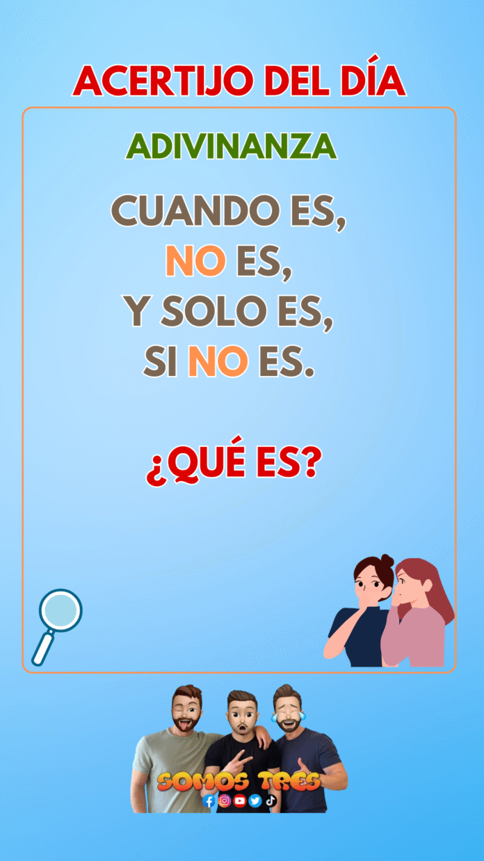 InicioSin categoríaACERTIJO DEL DIA Sin categoría ACERTIJO DEL DIA By Somos Tres 2 de octubre de 2025 0 30 Cuota FacebookWhatsAppTwitterPinterest Existe como afirmación, pero su esencia es justamente no ser verdad. En otras palabras: solo puede ser “algo” cuando lo que expresa no es real. La solución es una mentira Cuota FacebookWhatsAppTwitterPinterest Artículo anterior¿Cuánto es la mitad de, 8 más el doble de 10?Artículo siguiente¿Qué logo es el correcto? Somos Treshttps://somostres.tv RELATED ARTICLES Sin categoría Reordena las palabras y descubre los transportes 6 de octubre de 2025 Sin categoría ACERTIJO DEL DIA 6 de octubre de 2025 Sin categoría Descubre los 4 países 3 de octubre de 2025 - Advertisment - LO MÁS VISTO Reordena las palabras y descubre los transportes 6 de octubre de 2025 ACERTIJO DEL DIA 6 de octubre de 2025 Descubre los 4 países 3 de octubre de 2025 ¿Cuántos cuadrados hay en la imagen? 3 de octubre de 2025 Cargar más